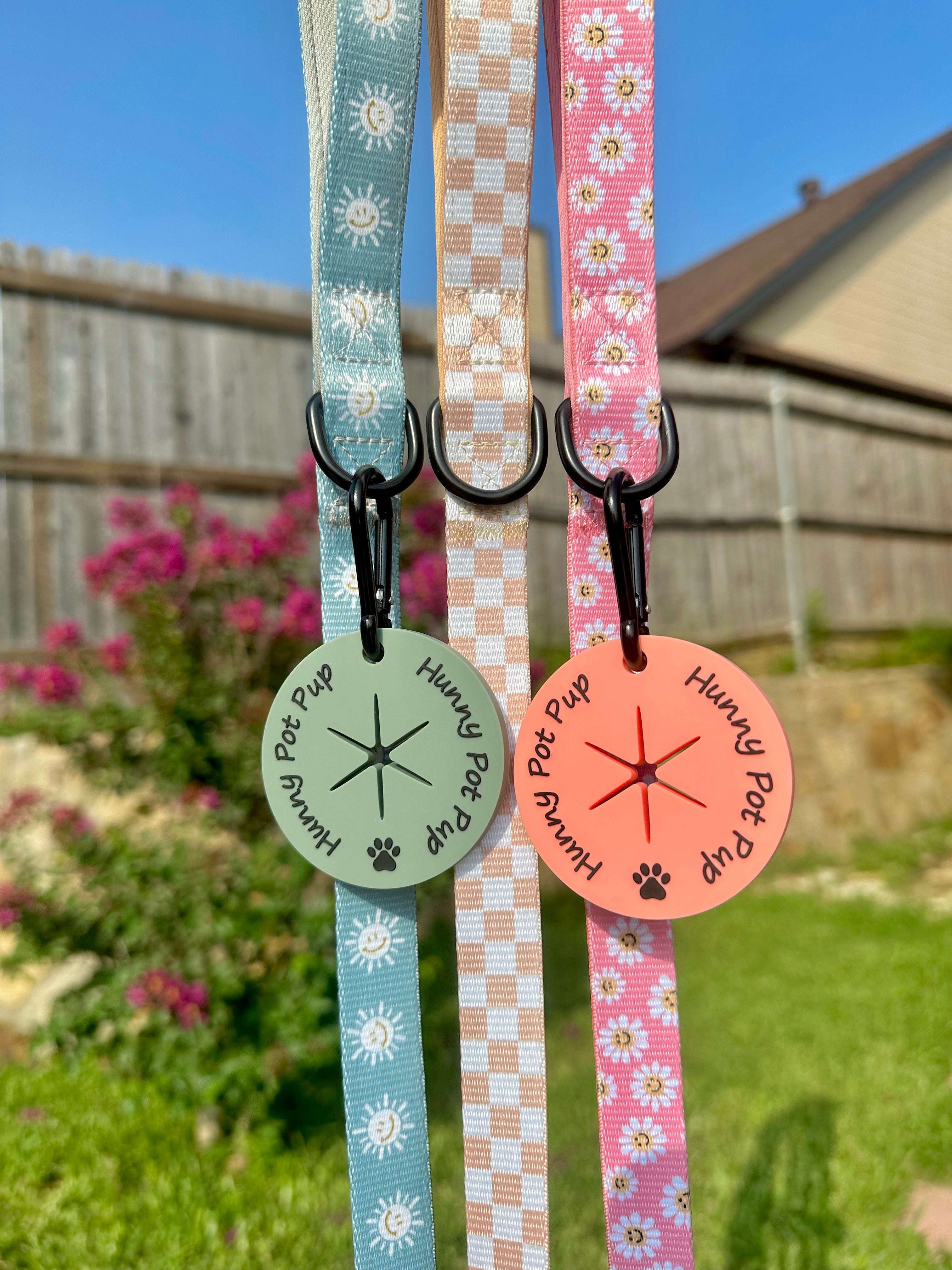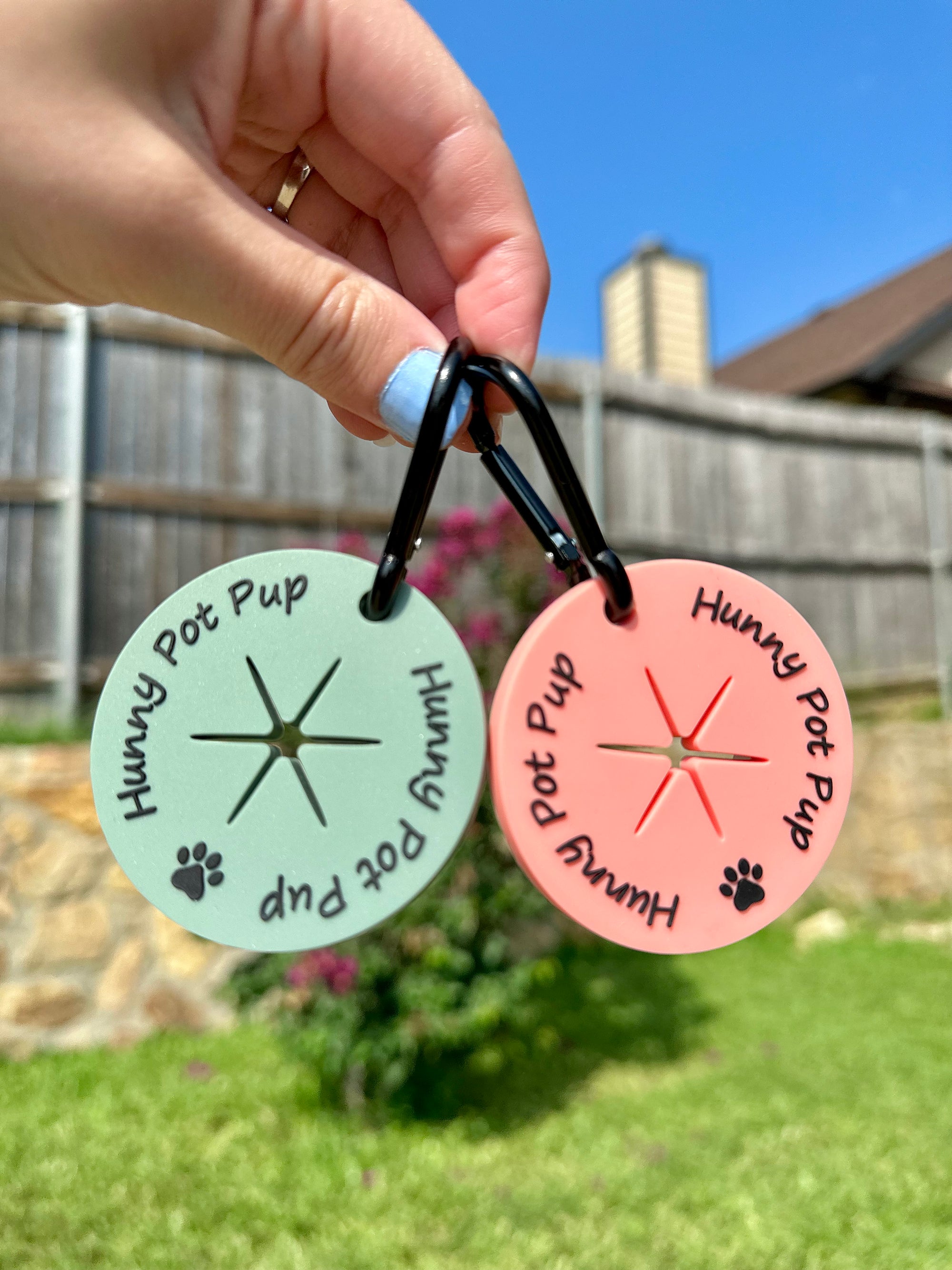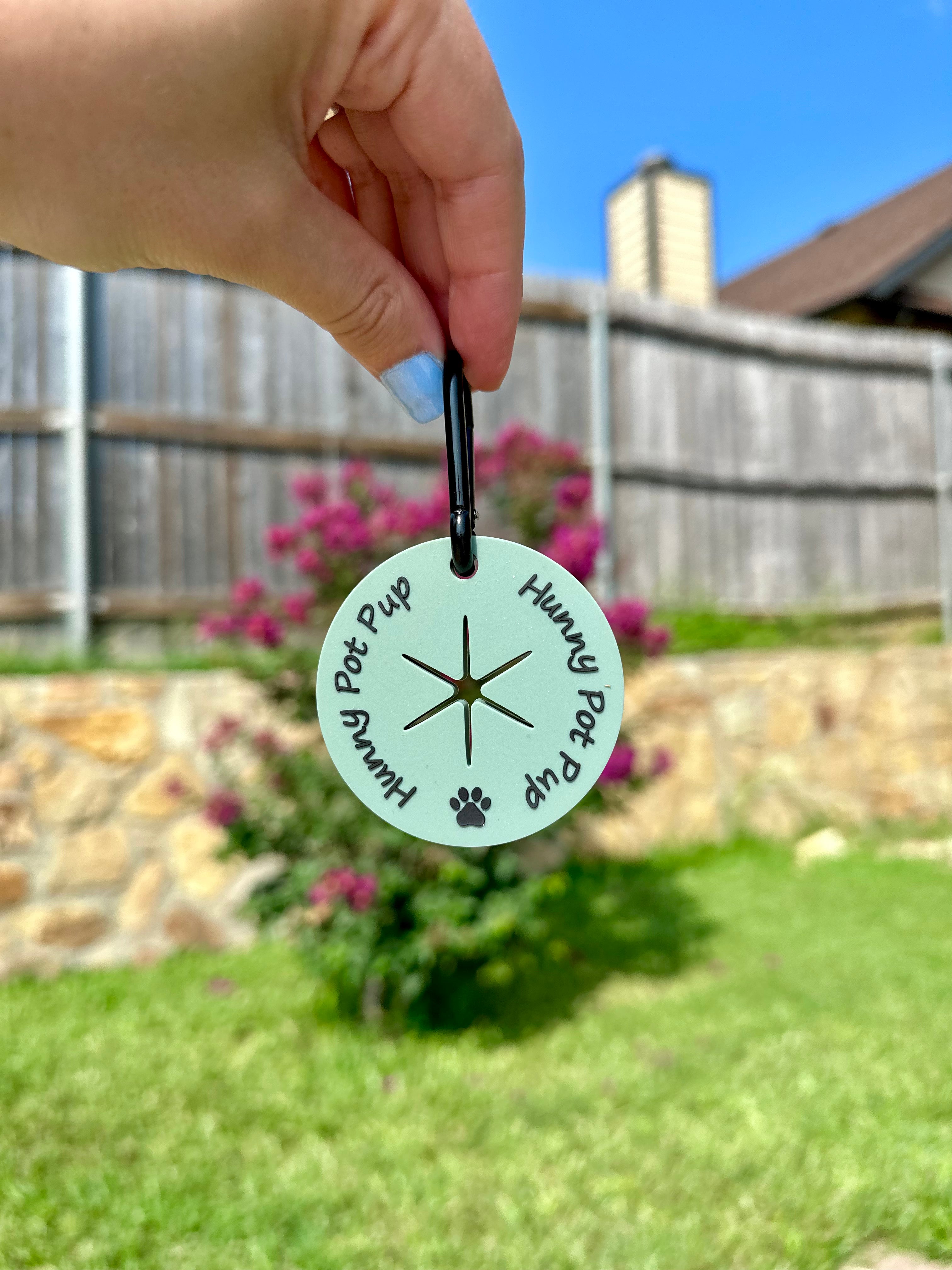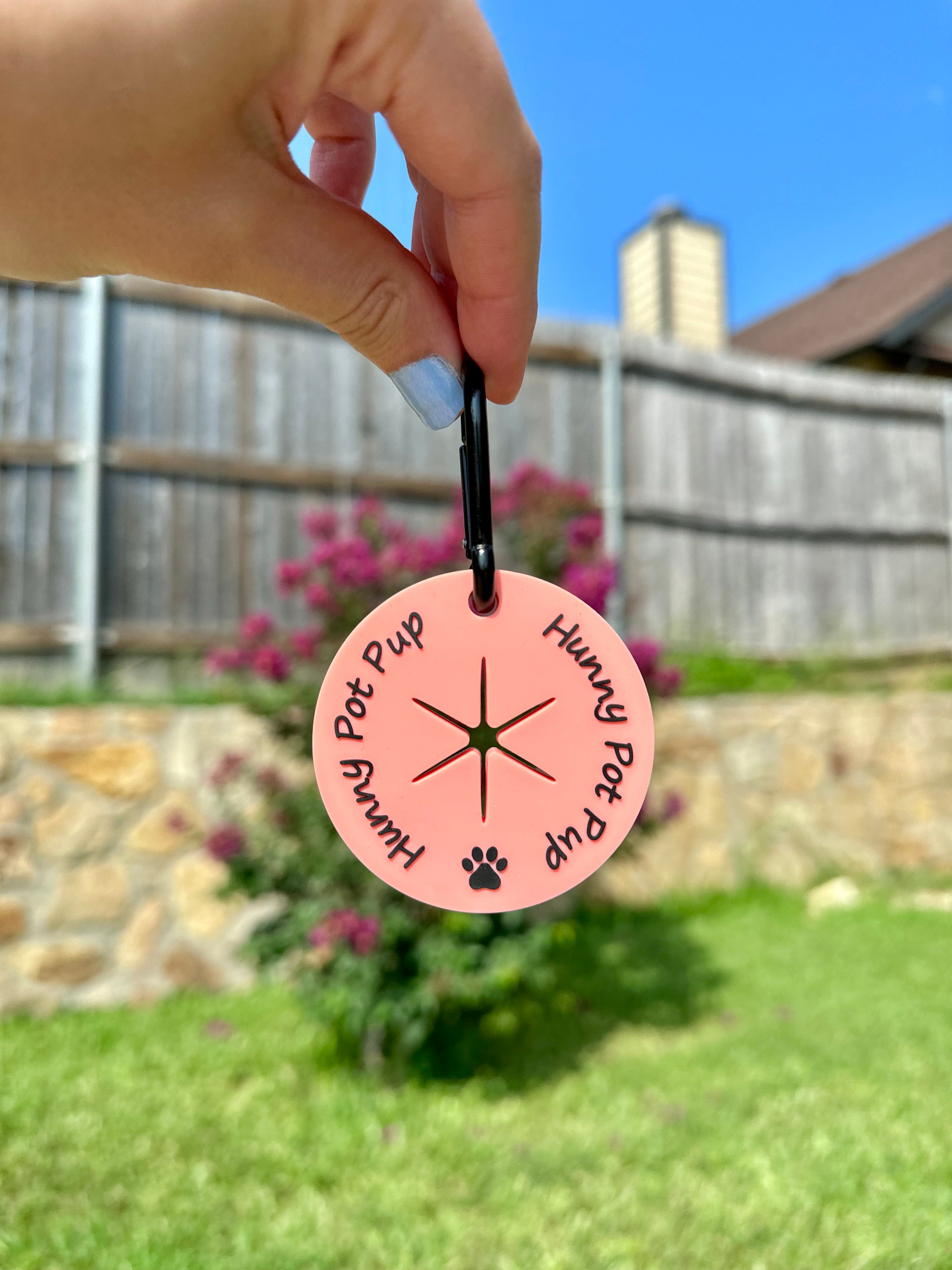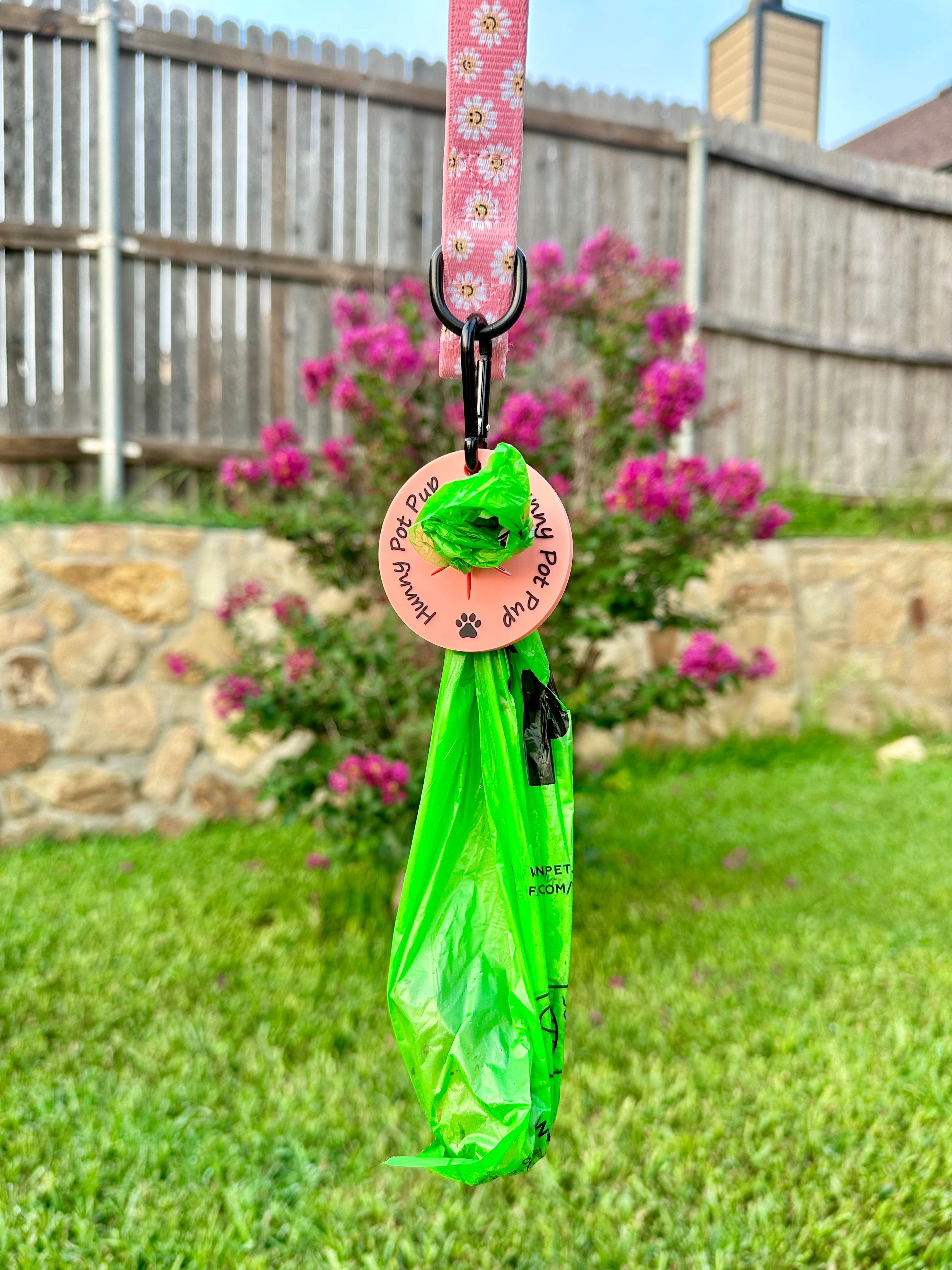 Never carry your dogs poo again! After you tie a knot at the top of the used poo bag, simply push the knot through the center hole and voila! Attach the clip to the D-ring on your leash and you now have poo free hands for the rest of your walk!